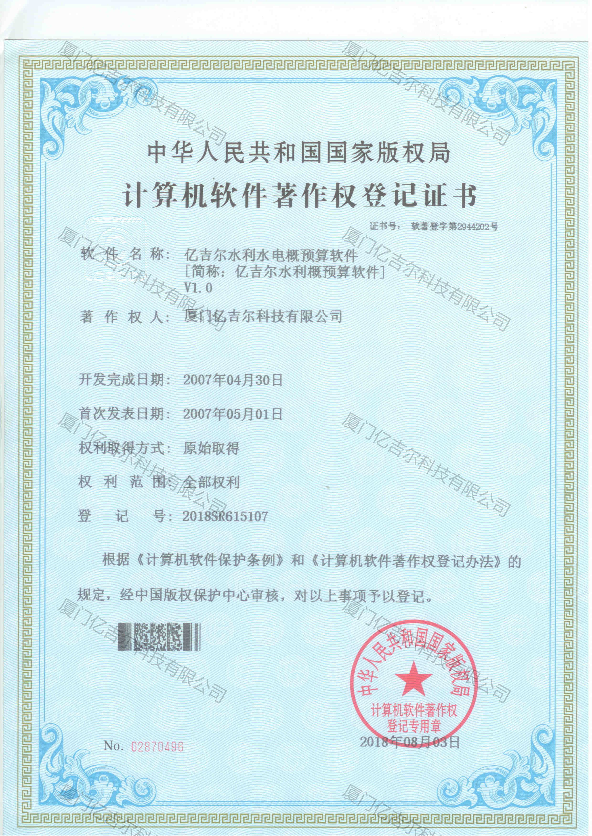 億吉爾水利水電概預(yù)算軟件著作權(quán)登記證書 發(fā)布日期:2018年08月03日 瀏覽次數(shù):3511 關(guān)鍵字: 公司 1/1億吉爾水利水電概預(yù)算軟件著作權(quán)登記證書