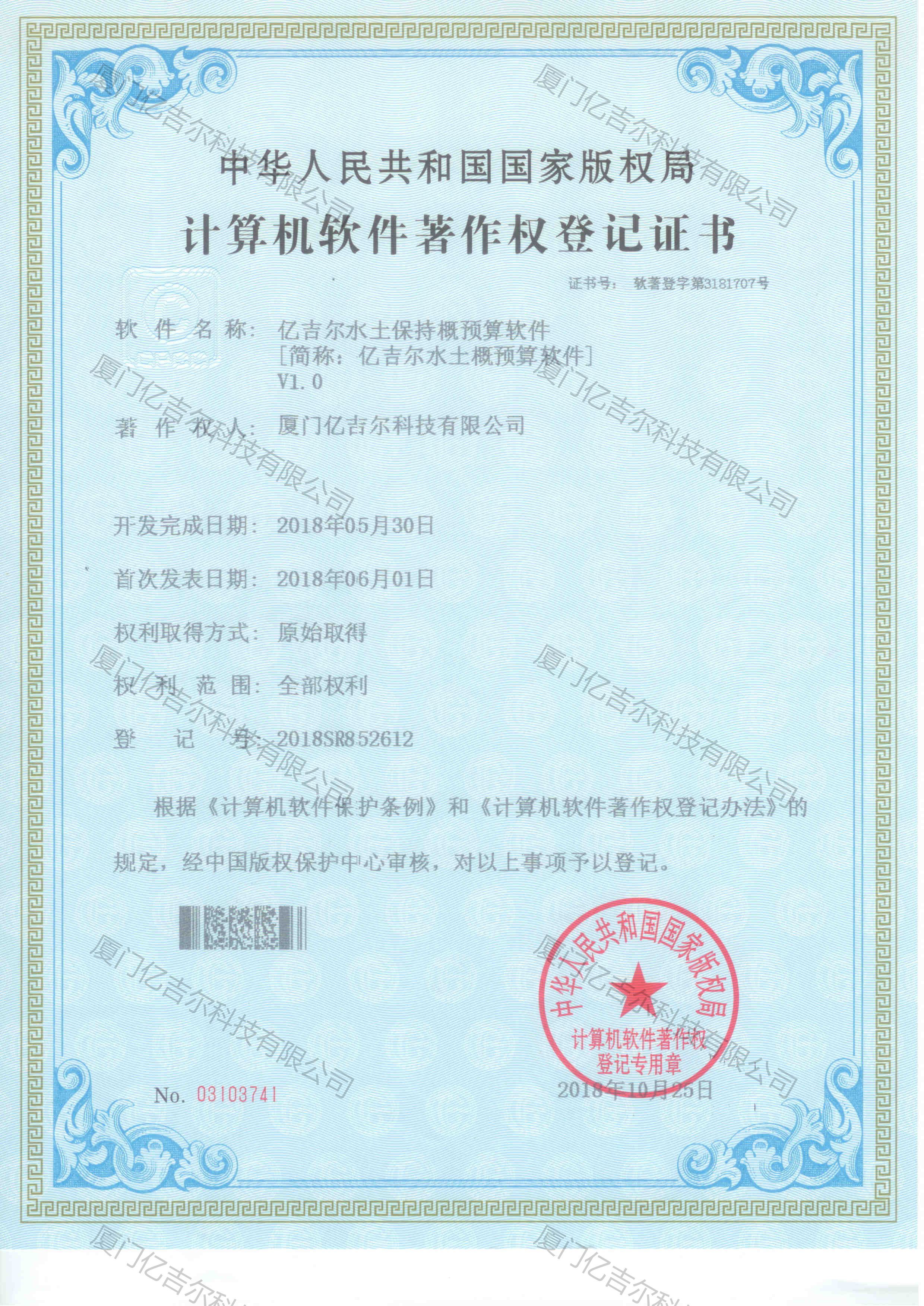 億吉爾水土保持概預(yù)算軟件著作權(quán)登記證書 發(fā)布日期:2018年10月25日 瀏覽次數(shù):3803 關(guān)鍵字: 公司 1/1億吉爾水土保持概預(yù)算軟件著作權(quán)登記證書