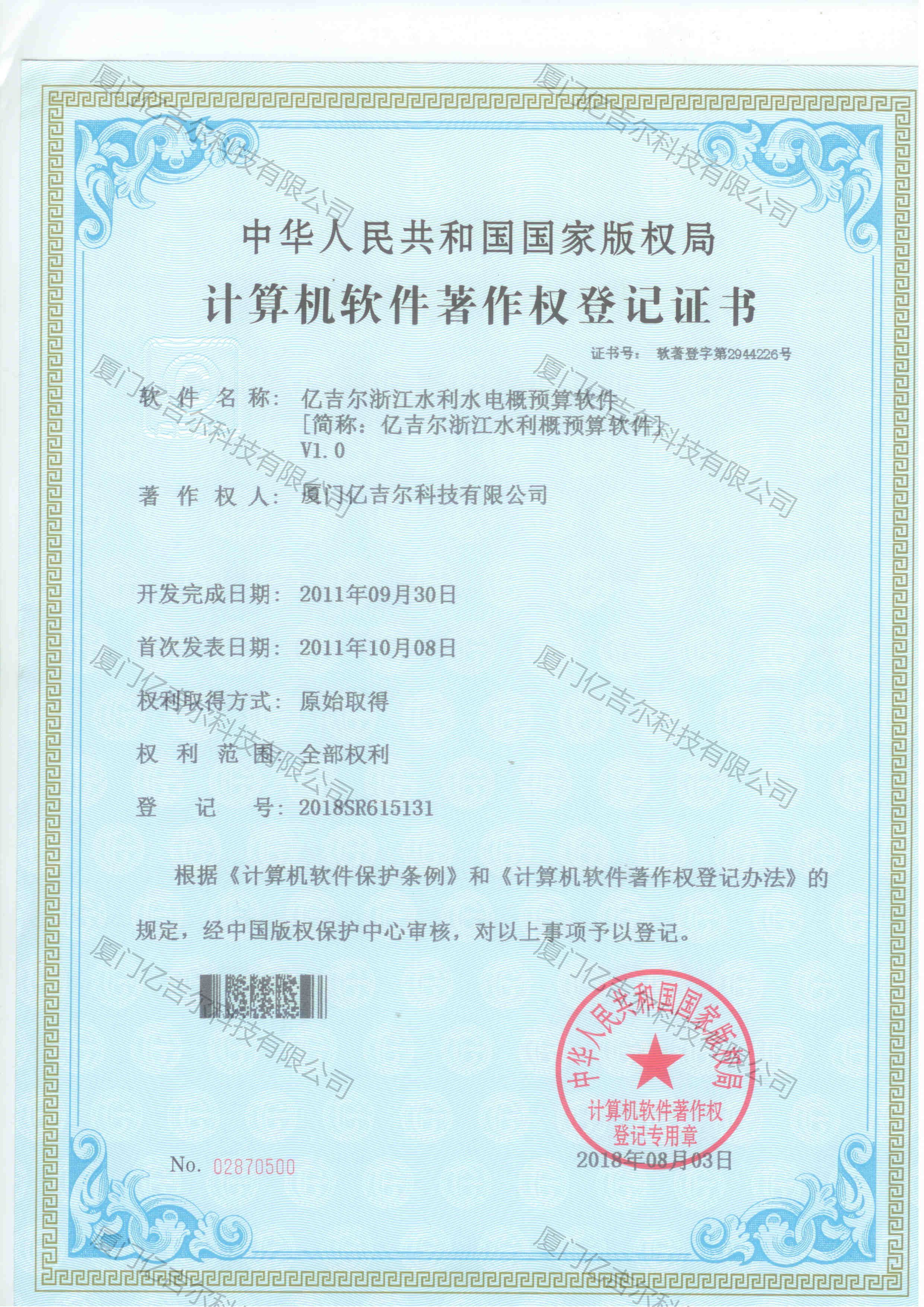 億吉爾浙江水利水電概預(yù)算軟件著作權(quán)登記證書 發(fā)布日期:2018年08月03日 瀏覽次數(shù):3476 關(guān)鍵字: 公司 1/1億吉爾浙江水利水電概預(yù)算軟件著作權(quán)登記證書